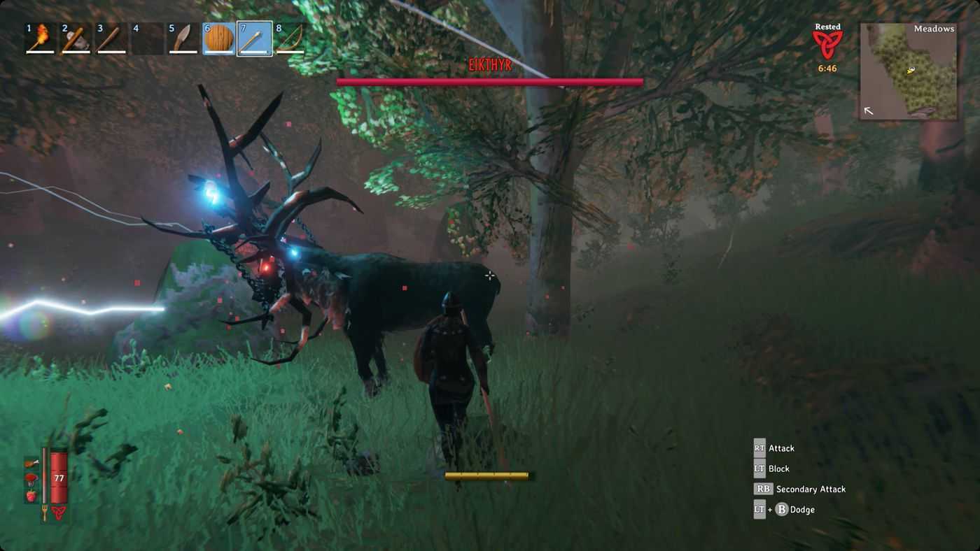 Приготовились к битве с Эйктюр в Valheim? В таком случае направляйтесь к алтарю, разместите в него трофеи и под аккомпанемент внезапно наступающей грозы предвкушайте сражение. Волшебный олень использует несколько атак: бодание рогами впереди себя, дистанционная атака молнией и удар копытами по земле, наносящий урон в радиусе нескольких метров от Эйктюра. Наиболее простая тактика сражения – атаковать с помощью лука или метательных копий, держась на почтительном расстоянии от оленя. Решив встретиться с боссом в ближнем бою, всегда держитесь сбоку или сзади животного, таким образом все его атаки, помимо удара копытами, не смогут попасть по вам.