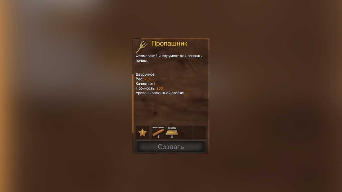 Создание пропашника — самая сложная часть всего процесса. Вы не сможете скрафтить его, пока не добьётесь значительного прогресса в игре, поэтому создать ферму в самом начале игры у вас не получится. Для создания пропашника требуется пять бронзовых слитков и пять единиц цельной древесины. Эти материалы бывает непросто найти.
