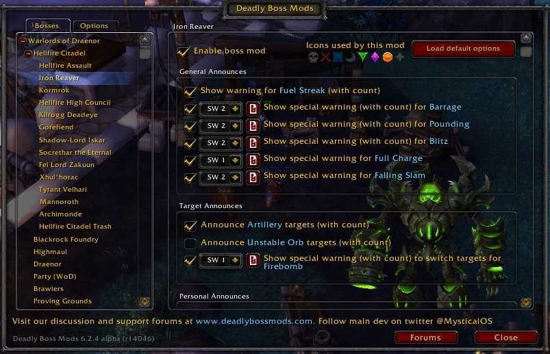 DBM – один из обязательных аддонов для рейдеров/ключников. Он информирует игроков о применяемых боссами и мобами умениях во время боя, помогает избежать гибели персонажа в определенных ситуациях и в целом значительно облегчает прохождение рейдов и подземелий. |