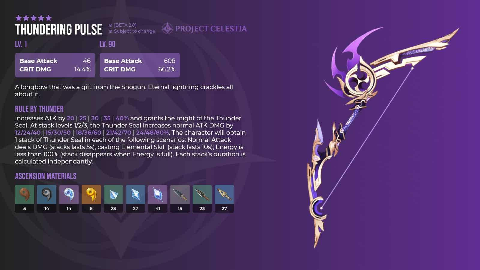 Громовой пульс — пятизвездочный лук с 46 единицами базового урона. По умолчанию он повышает силу атаки владельца на 20-40%. Дополнительно он создает Громовые эмблемы — у них три уровня, повышающих урон обычной атаки на 15-30-50%.