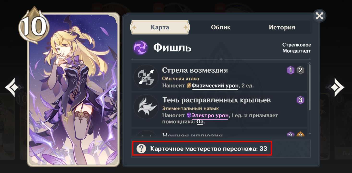 Далее в разделе карт персонажей (уровень есть только у них) необходимо открыть просмотр любой из карт. В строчке «Карточное мастерство персонажа» вы увидите уровень карты.