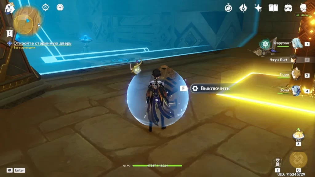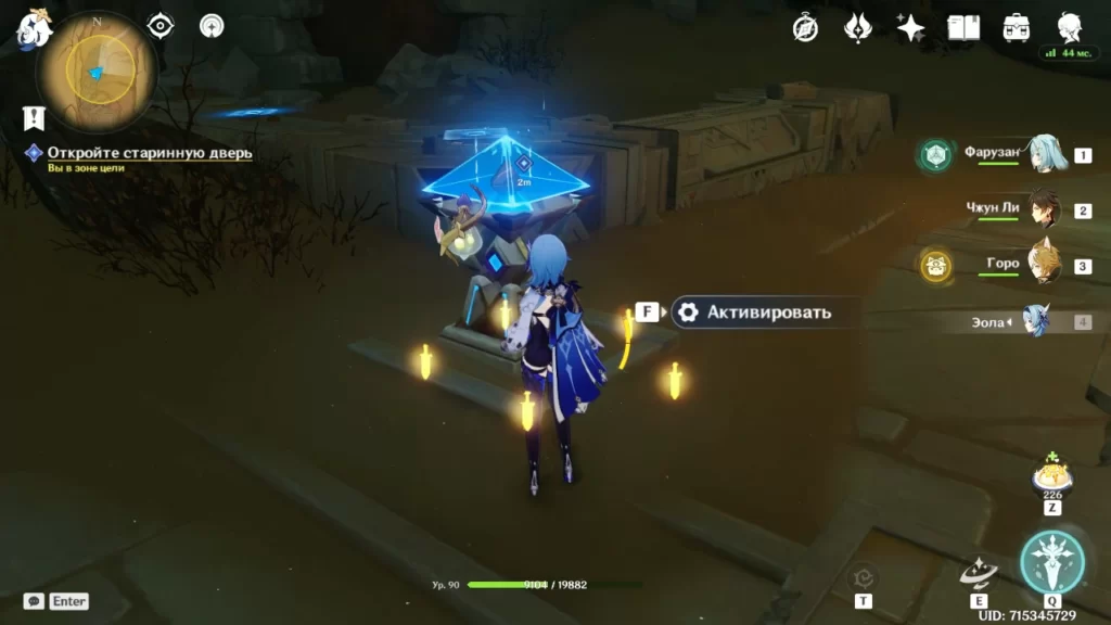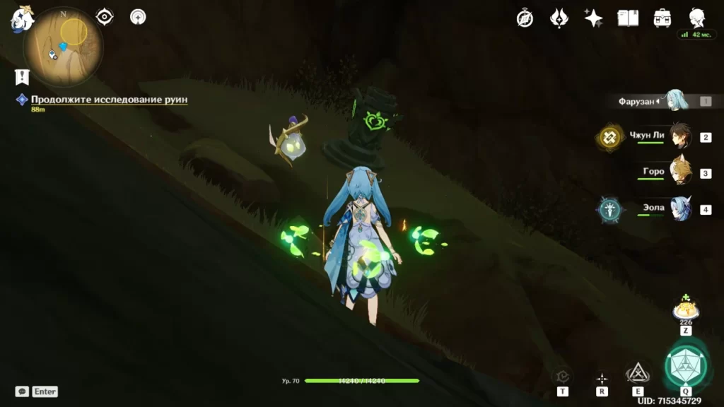 После того, как Вы нажмете кнопку, идите в указанную точку и сыграйте песню Вамадхи. В пространстве далее Вы найдете три заблокированных Дендро столба и три висящих над ними Дендро объекта. Активируйте объекты с помощью Дендрогранумов, и посмотрите на то, куда от каждого из них идет энергия. Начинать активацию Дендро столбов можно с любого, но затем нужно идти по порядку, в котором идет энергия между висящими объектами. Нажмите кнопку, чтобы опустить уровень воды еще раз. Когда появится задание искать пещеру, куда ты можно было войти, возьмите Дендрогранумы и разрушьте блок с зеленой меткой на нем.