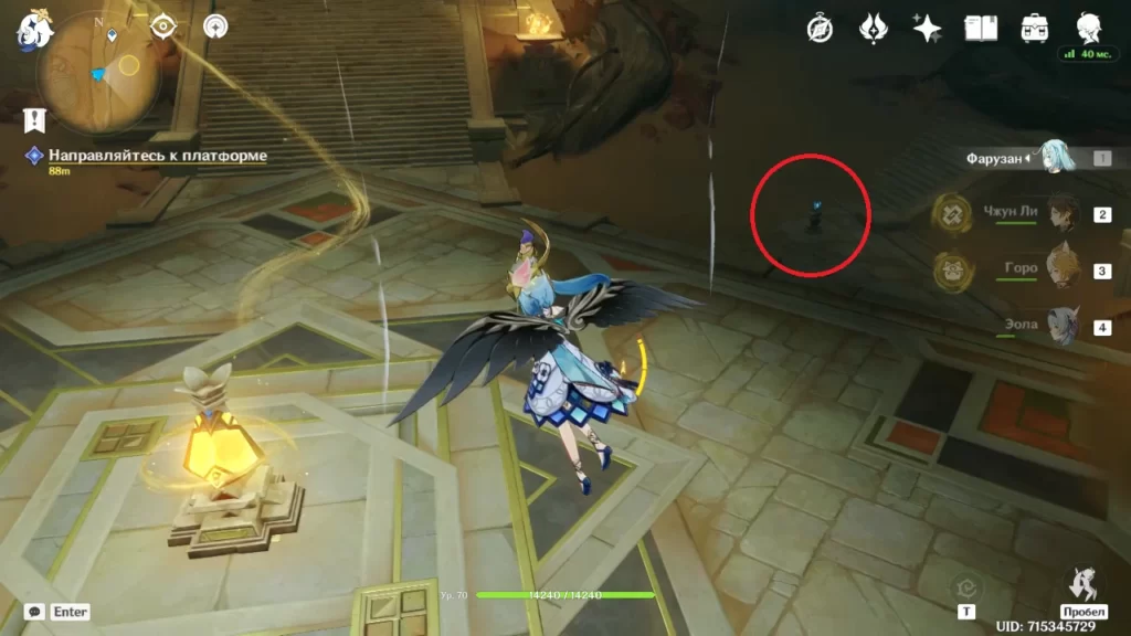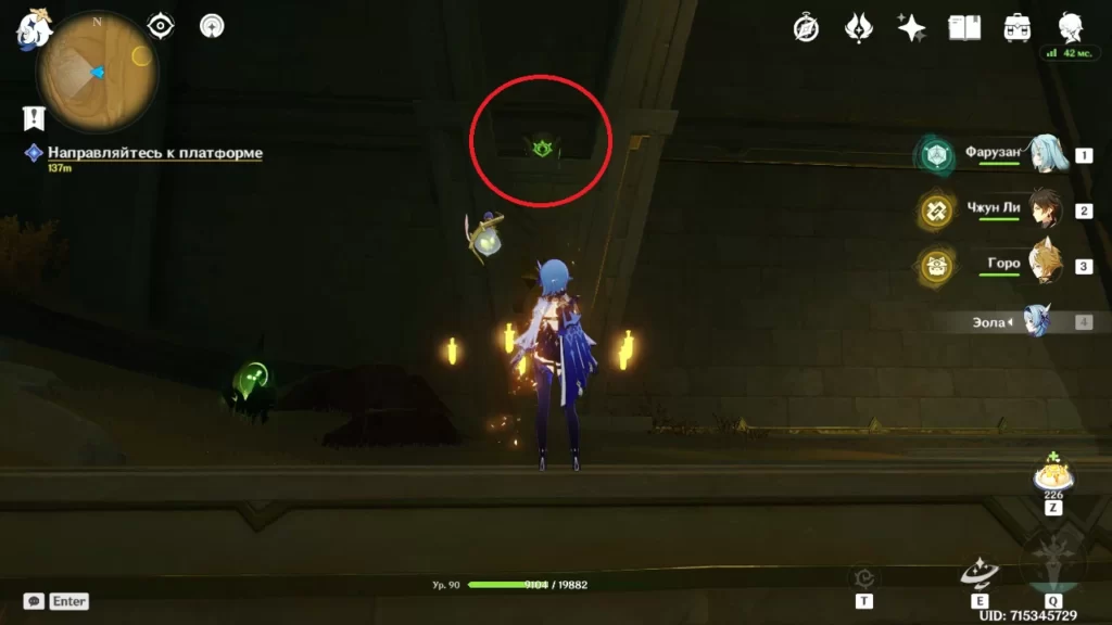 После второго янтаря нужно будет активировать куст силой Дендро, чтобы на магнитных точках попасть наверх, где придется выполнить испытание, выстрелив Дендрогранумами в висящие Дендро объекты — после первого стрелять по нарастанию высоты, подсказкой также послужит течение энергии.