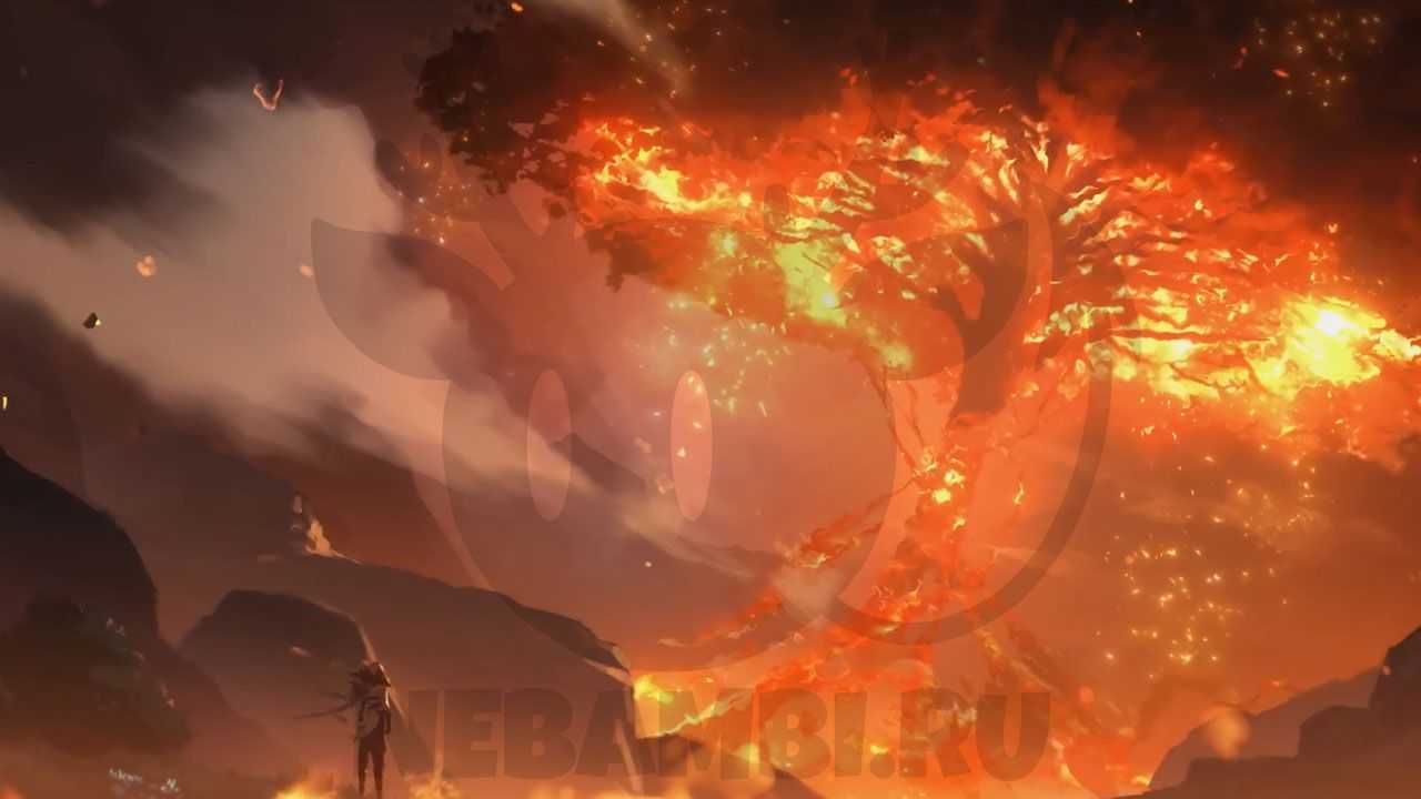 После этого мы переносимся в другое место, где слышим голос молодой девушки и голос Дотторе. А далее мы видим Дотторе на фоне сгорающего огромного древа. Думаю, конкретно эта сцена из видения Коллеи о будущем Сумеру, в котором он придет за Сердцем бога Дендро Архонта.