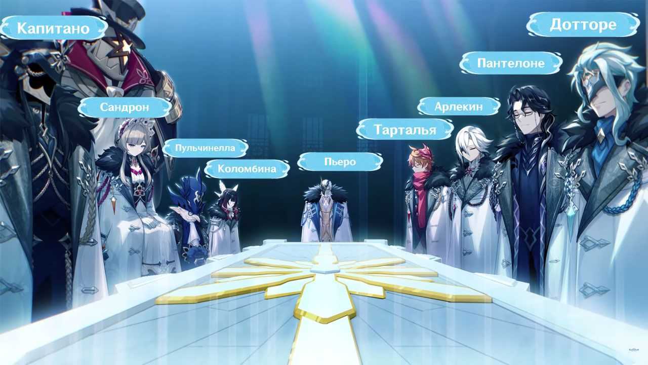 В этот момент разгорается спор, из-за того, что утрату Синьоры решили почтить остановив дела всей Снежной всего на пол дня. Это первый раз, когда нам показали как выглядят все члены Предвестников Фатуи и их отношение между собой. Видно, как они друг с другом не ладят, но все же в такой момент они собрались вместе.