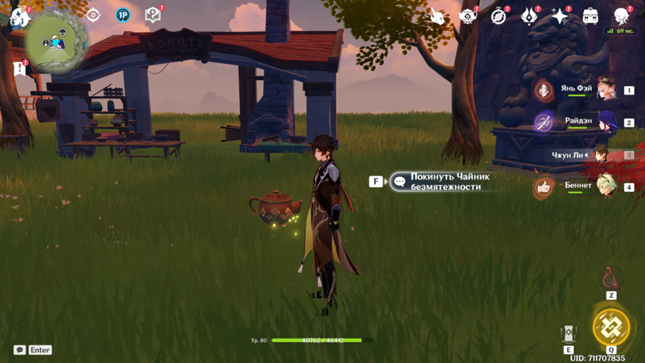 Другой способ – взаимодействие с чайником. Аналогично входу требуется активировать чайник через инвентарь, чтобы он появился в мире, и стала доступна опция выхода из обители.