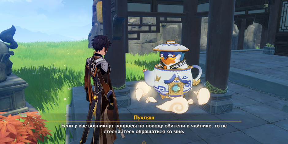 Рядом со входом в главное здание обители располагается Пухляш – дух Чайника Безмятежности, который сопровождает Путешественника на всем его пути архитектора, а также дает игроку доступ к интерфейсам покупки, создания или просмотра уровня доверия.