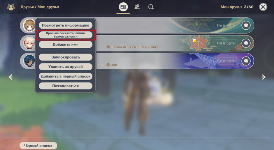 Посещение Чайников других Путешественников возможно через меню друзей – при нажатии на аватар игрока появляется опция «Просьба посетить Чайник безмятежности». Единственное условие, которое должно быть соблюдено для возможности посещения обителей других пользователей – наличие у них самой обители.