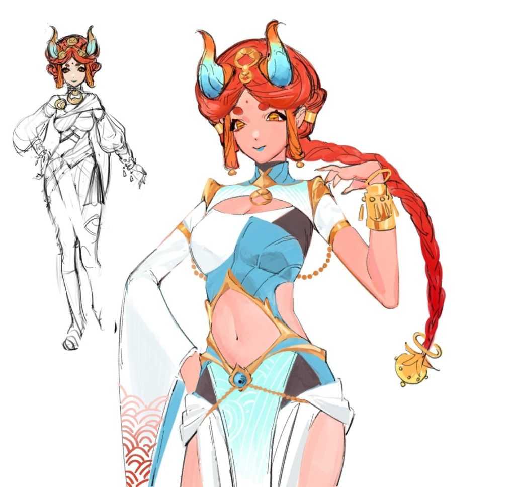- Нилоу. Нилоу – прекрасная девушка с очаровательными рожками, которые по форме похожи на рога Аждахи и отличаются от них только цветом. Она носит белую вуаль, меч и глаз бога стихии Гидро. Предположительно, она будет целителем.