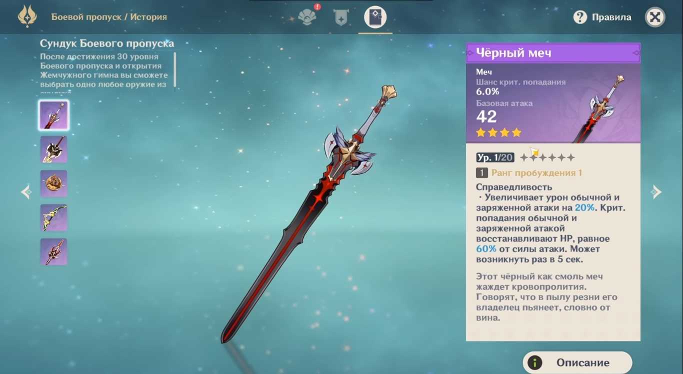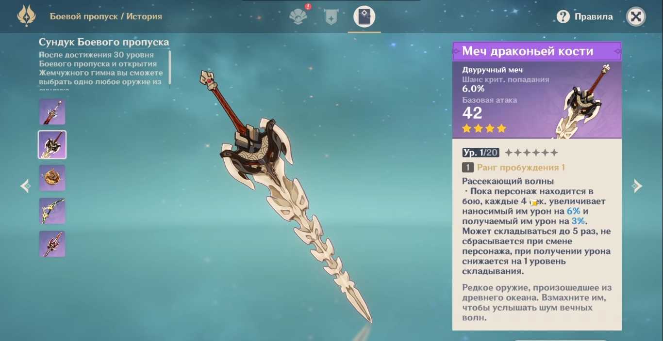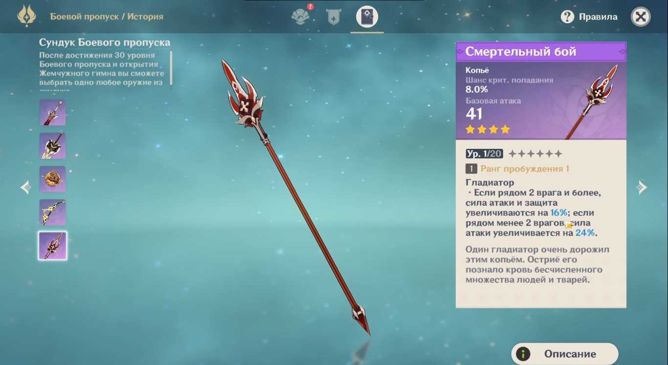 А еще на 30 уровне ленты боевого пропуска вы получите оружие на 4 звезды. Главная фишка оружия, которое вы здесь получите, не в абилках, а в шансе на крит. В Genshin Impact криты – это имба, оружие с критами нереально вытаскивает игру. Подробное описание оружия, которое вы можете получить в ленте, вы найдете на скриншотах ниже.