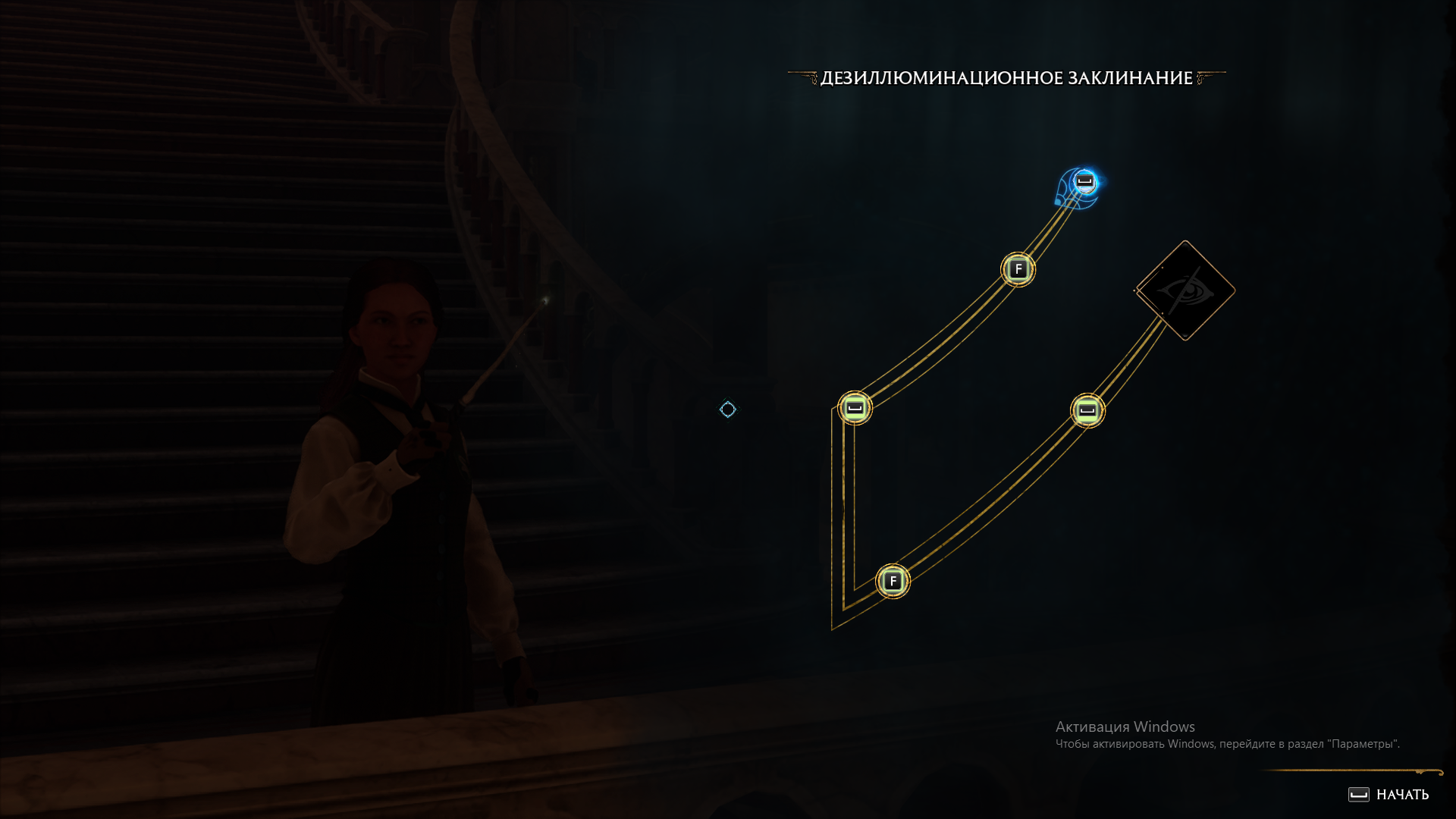 Чтобы выучить любое заклинание, нужно пройти простую мини-игру: с помощью мыши/левого стика – проведите курсор по контуру символа быстрее, чем его догонит красная искра. Для ускорения движения курсора нажимайте соответствующую кнопку, когда курсор проходит по ее указателю.