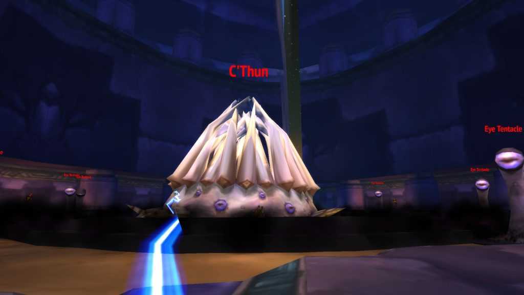 Начало боя — это очень важный момент, особенно в случае с К’Туном. Основная способность босса на первой фазе — это зеленый луч. Босс использует ее в первую же секунду боя. Луч применяется к случайной цели и наносит ей урон, а потом перескакивает на новую цель и наносит ей удвоенный урон. Луч распространяется до тех пор, пока у него не закончатся цели.