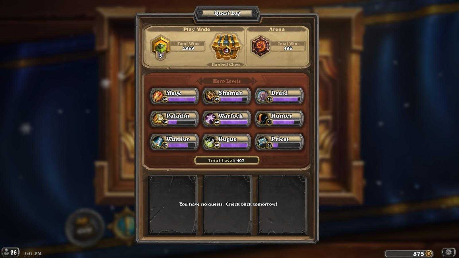 Журнал заданий. Указывается восклицательным знаком на значке глобуса / компаса, в журнале заданий отображаются ваши выигрыши в режиме воспроизведения, ваш лучший рейтинг «Арена» (сколько побед вам удалось) и общая победа Арены, ваш уровень с каждым из девяти классов (до текущего уровня 60), общий уровень по всем девяти классам, а также до трех одновременных ежедневных квестов (цели, которые вы можете достичь, чтобы заработать золото). Вы можете повторно выполнить квест, который вам не нравится один раз в день, щелкнув красный «X» в верхнем правом углу соответствующего квадрата.