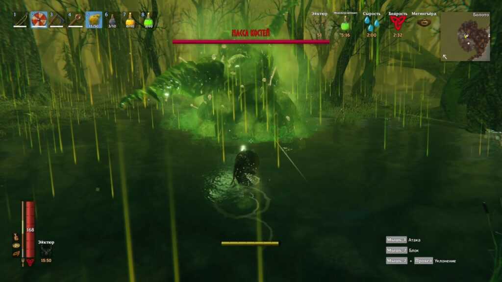 Медленный, но стопроцентный способ расправиться с Массой костей, ни разу не погибнув — воспользоваться тактическим преимуществом. Вас защитит любая каменная постройка на Болоте — разрушенное здание, вход в склеп или алтарь. Ходите вокруг сооружения, отрываясь от босса на достаточное расстояние и восстанавливая стамину. Когда он подползет ближе, бейте кувалдой по земле. Здесь главное следить, когда слизень начнет блевать, чтобы не попасть в облако отравленного газа. Двигается босс существенно медленнее вашего персонажа, поэтому оторваться от него несложно.