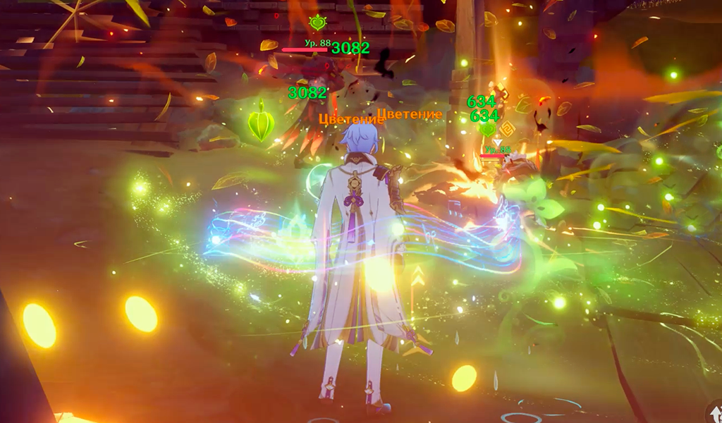 При вызове Цветения Пиро-атакой тоже можно задеть врага. Если на нём будет Гидро-аура, это не так страшно. Гидро аура потратится с множителем 0.5, те есть, не так сильно. Но если на враге будет Дендро-аура, начнётся Горение. Это паразитная реакция, которая очень быстро потребляет Дендро-ауру и накладывает Пиро в небольшом радиусе каждые 2 секунды. По окончании Дендро-ауры противник продолжит гореть, и новыми Дендро-атаками Горение будет лишь продлеваться. При Горении нужно нейтрализовать на противнике Пиро-ауру, лучше всего Гидро-атакой.